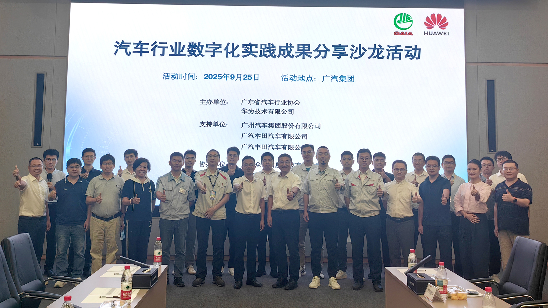 为助力大湾区汽车/摩托车产业数字化协同发展,2025年9月25日下午,由广东省汽车行业协会与华为技术有限公司联合主办,众时科技、迈威科技、新迪数字协办,广汽集团、广汽本田、广汽丰田支持举办的“汽车行业数字化实践成果分享沙龙”在广汽集团番禺总部成功举办。活动邀请了华为技术、广汽本田、广汽丰田、众时科技、迈威科技、新迪数字等企业代表,分享了各自在数字化建设中的特色实践与服务经验。广汽集团、飞肯摩托、三雅摩托、广汽部件、广汽商贸、广丰发动机、中汽研广州检验、斯坦雷电气、半径母线、华冠精冲、联友科技等单位的数字化相关负责人共同参与了本次沙龙。