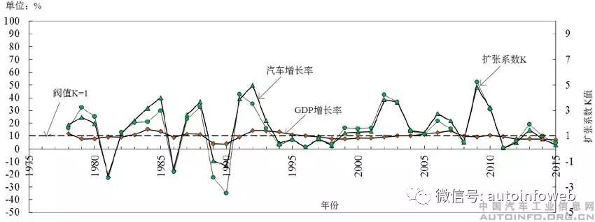 2015年汽车产量2050.33万辆,增长率3.25%,GDP增长率6.9%,扩张系数K为0.47;2016年汽车产量2811.9万辆,同比增长 14.5%,GDP增长率6.7% ,扩张系数K为2.16。