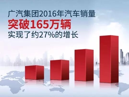 2016年广汽集团全年实现整车产销分别约为165.96万辆和165万辆,同比增长分别约30%和27%,销量增幅高于行业平均水平12个百分点,位居国内六大国有汽车集团之首。自主品牌广汽传祺2016年累计销量达37.2万辆,同比劲增90.66%;其中明星车型GS8月销近万台,在一直由合资品牌占据的中大型7座SUV细分市场跃升至第二位。同时,广汽集团在2016年连续四年入围《财富》世界500强并位居第303名,较2015年排名上升59位,上升幅度达16.3%。