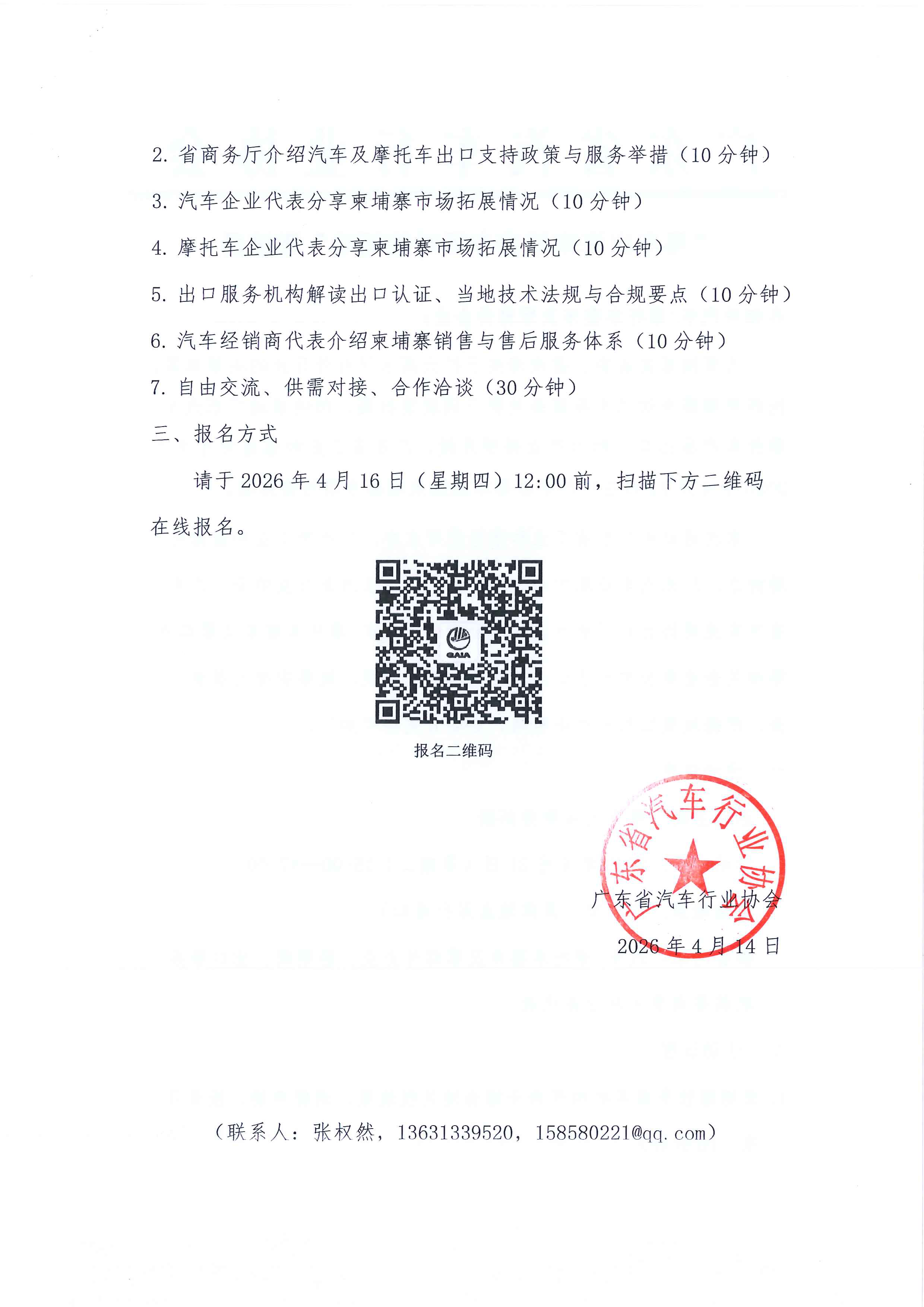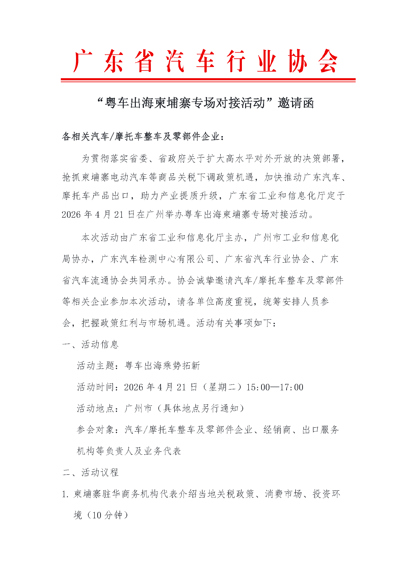 为抢抓柬埔寨电动汽车等商品关税下调政策机遇,加快推动广东汽车、摩托车产品出口,助力产业提质升级,广东省工业和信息化厅定于 4 月 21 日在广州举办粤车出海柬埔寨专场对接活动。协会作为承办单位,诚邀汽车/摩托车整车及零部件等相关企业参加本次活动,请各单位高度重视,统筹安排人员参会,把握政策红利与市场机遇。