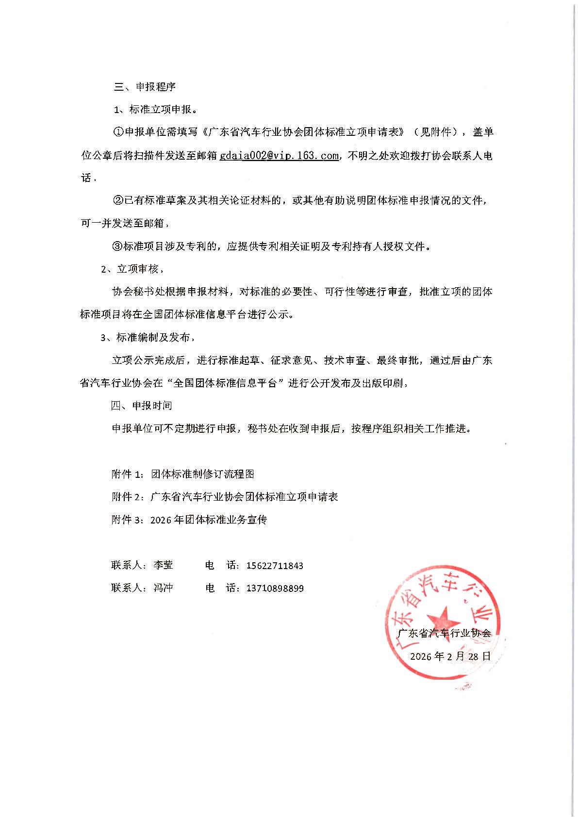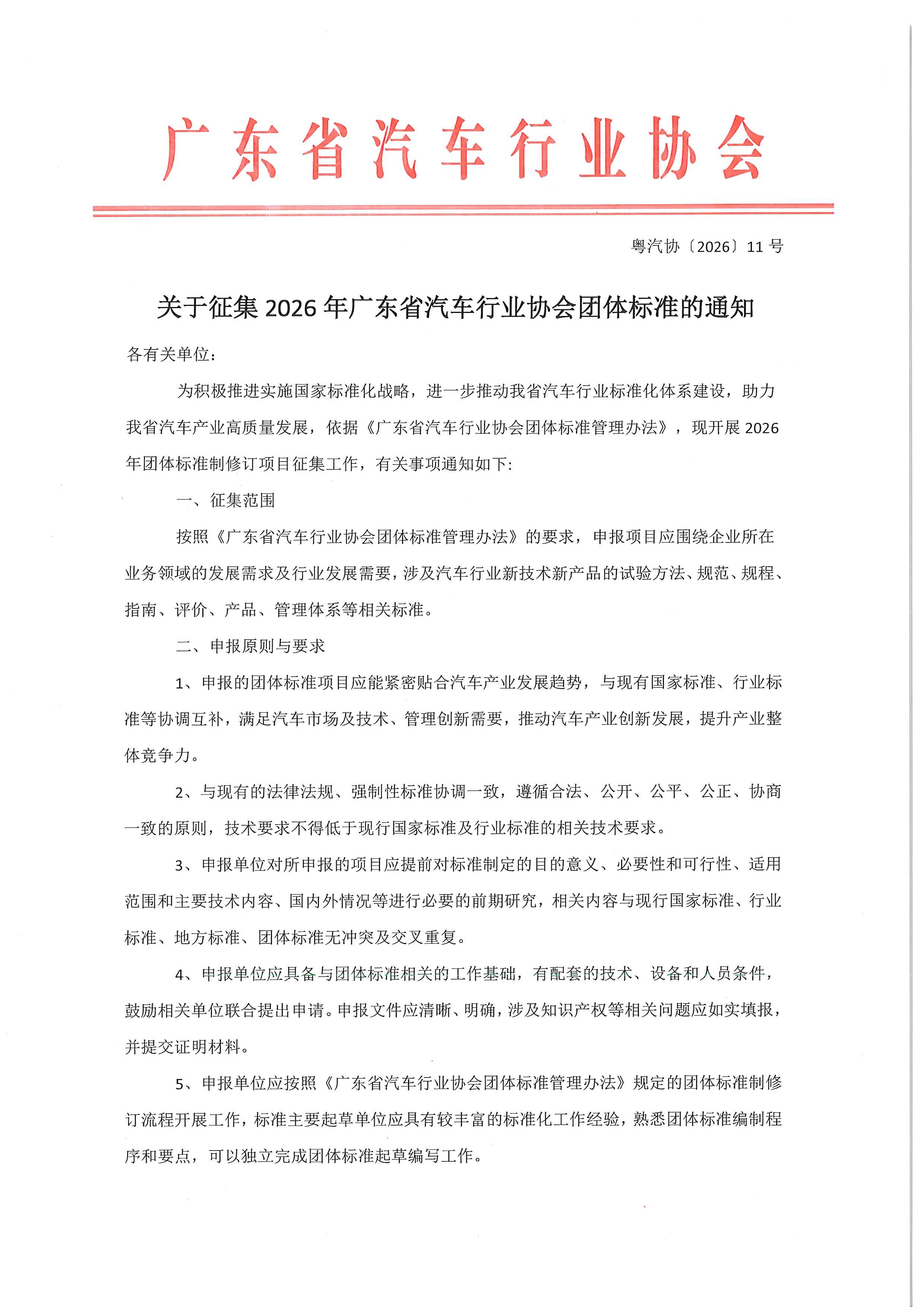 关于征集2026年广东省汽车行业协会团体标准的通知